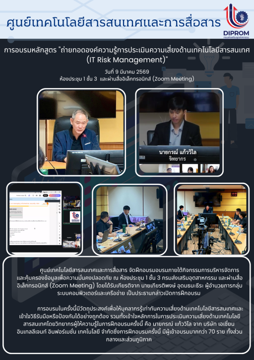 การอบรมหลักสูตร "ถ่ายทอดองค์ความรู้การประเมินความเสี่ยงด้านเทคโนโลยีสารสนเทศ (IT Risk Management)" วันที่ 9 มีนาคม 2569